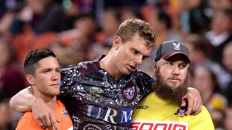 Trbojevic and dylan walker were two of three sea eagles injured in the win, as the fullback limped from campbelltown stadium on sunday in the 52nd.